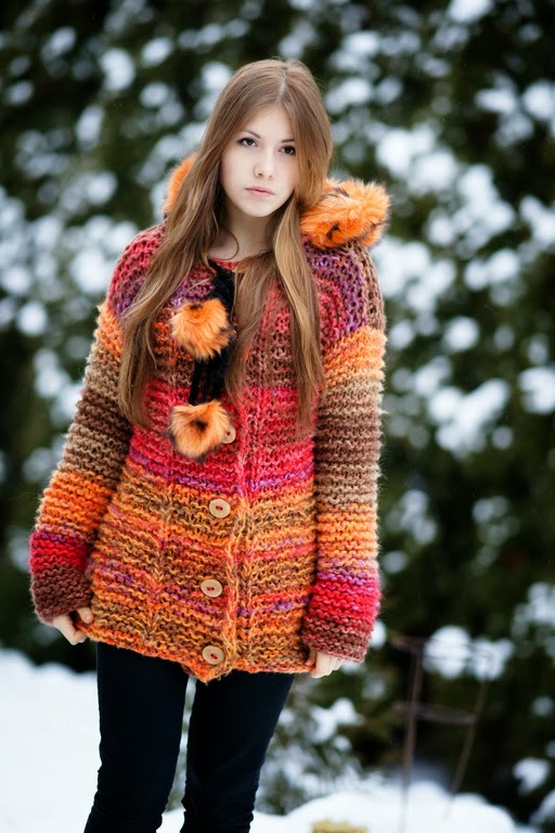 Oryginalny, gruby, bardzo ciepły sweter z kapturem ozdobiony sztucznym futrem. Wykonany ręcznie z najwyższej jakości delikatnej, melanżowej mieszanki Katia Yarns wełny, alpaki i akrylu oraz sztucznego futerka. Zapinany na sześć drewnianych guziczków. Zawiązywany dodatkowo na linii szyi troczkiem z dwoma futerkowymi pomponami. Kolory: neonowy różowy, pomarańcz, czerwony, fiolet, beże i brązy. Rozmiar - najlepiej będzie wyglądał na osobach posiadających szczupłą sylwetkę ( S, M, L ). PROJEKT AUTORSKI. Ze względu na układ kolorystyczny - pojedynczy egzemplarz. Pranie ręczne w 30 stopniach. Suszenie w stanie rozłożonym.